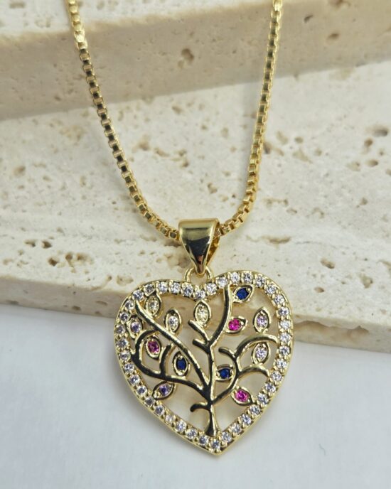 Μενταγιόν Καρδιά με Δέντρο της Ζωής και Πολύχρωμα Ζιργκόν από Ανοξείδωτο Ατσάλι σε Χρυσό Τόνο