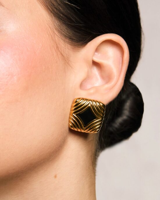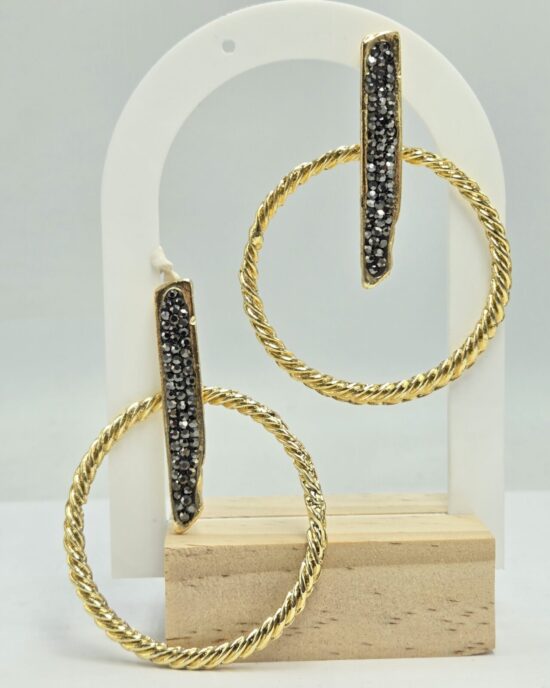 Κρίκοι Σκουλαρίκια με Μαύρες Πέτρες και Μπάρα από Ανοξείδωτο Ατσάλι σε Χρυσό Τόνο