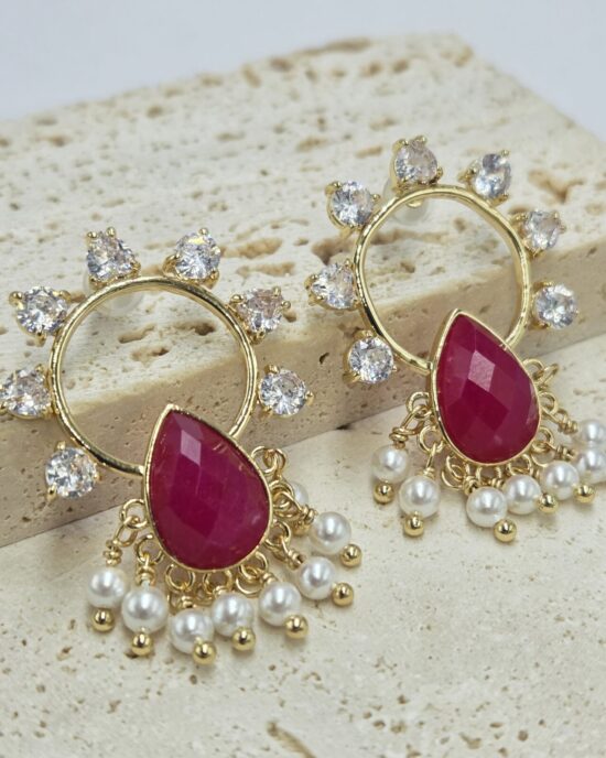 Εντυπωσιακά Σκουλαρίκια με Κόκκινη Πέτρα, Ζιργκόν και Πέρλες σε Χρυσή Απόχρωση